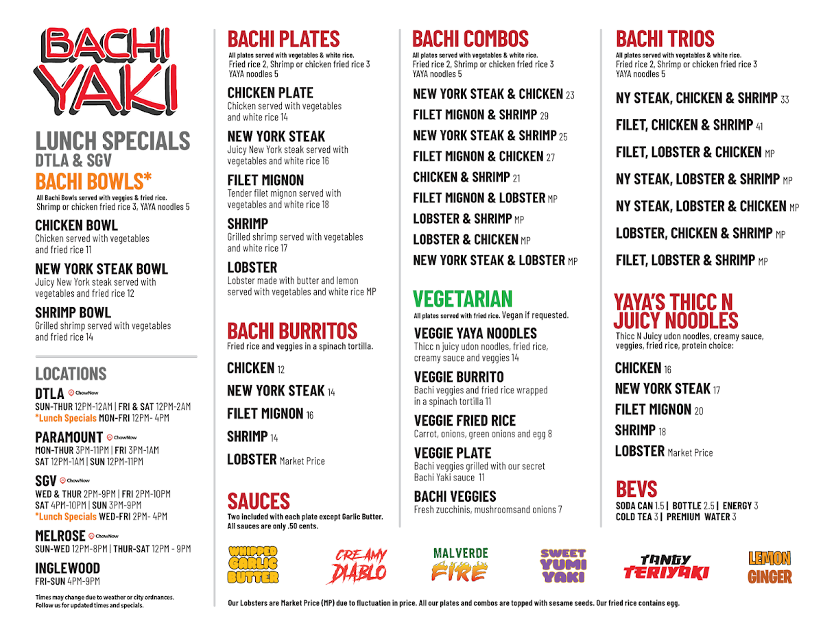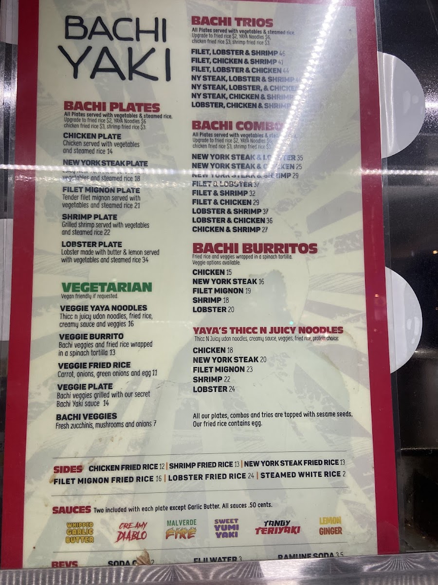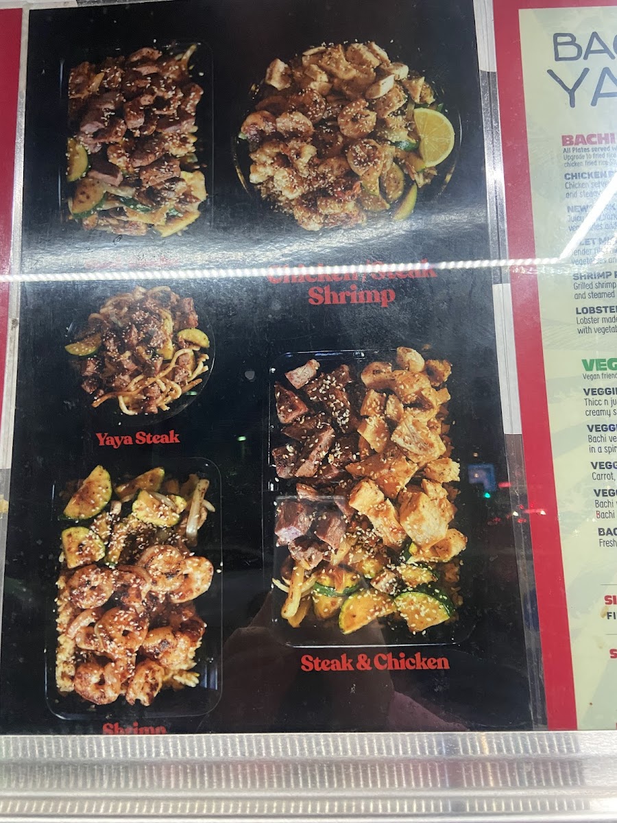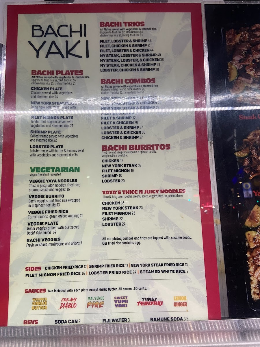 Bachi Yaki Japanese Grill offers an enticing variety of dishes that cater to a wide range of tastes. The menu features flavorful options, including bowls like the New York Steak Bowl, Chicken Bowl, and Shrimp Bowl, each offering a hearty and satisfying meal. For those craving noodles, the Lobster Yaya Noodles, Shrimp Yaya Noodles, and Chicken Yaya Noodles are perfect choices, with Filet Yaya Noodles and NY Steak Yaya Noodles offering an elevated twist. Sides like Steamed White Rice and Spicy Edamame complement the dishes well, and there are also more indulgent options like Chicken Fried Rice and Shrimp. The restaurant’s Bachi Trios are a must-try for variety, featuring combinations like NY Steak, Lobster & Shrimp Trio or Filet, Lobster & Shrimp Trio. If you're in the mood for something quick and handheld, the Filet Mignon Burrito, Chicken Burrito, and Lobster Burrito make excellent choices. Vegetarians are not left out either, with options such as the Veggie Burrito, Veggie Yaya Noodles, and Bachi Veggies. For larger plates, you can indulge in the Lobster Plate, Filet Mignon Plate, or the Shrimp Plate. The menu is rounded off with refreshing beverages like Canned Soda and Water, making for a well-balanced dining experience. Whether you’re seeking a light meal or a filling feast, Bachi Yaki offers something for everyone.